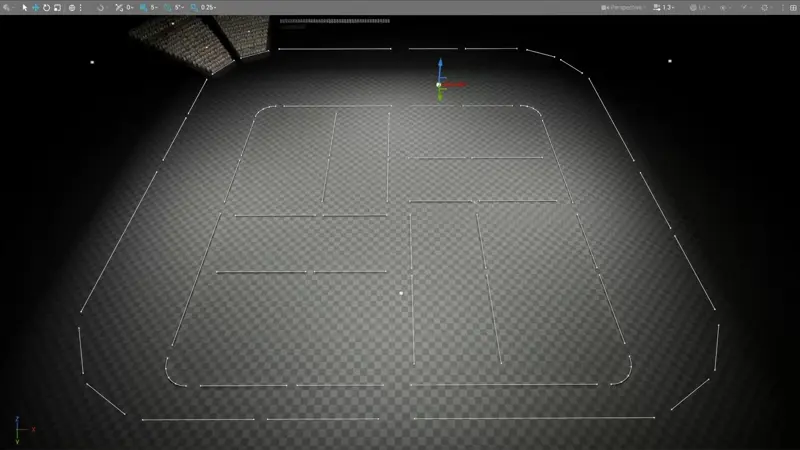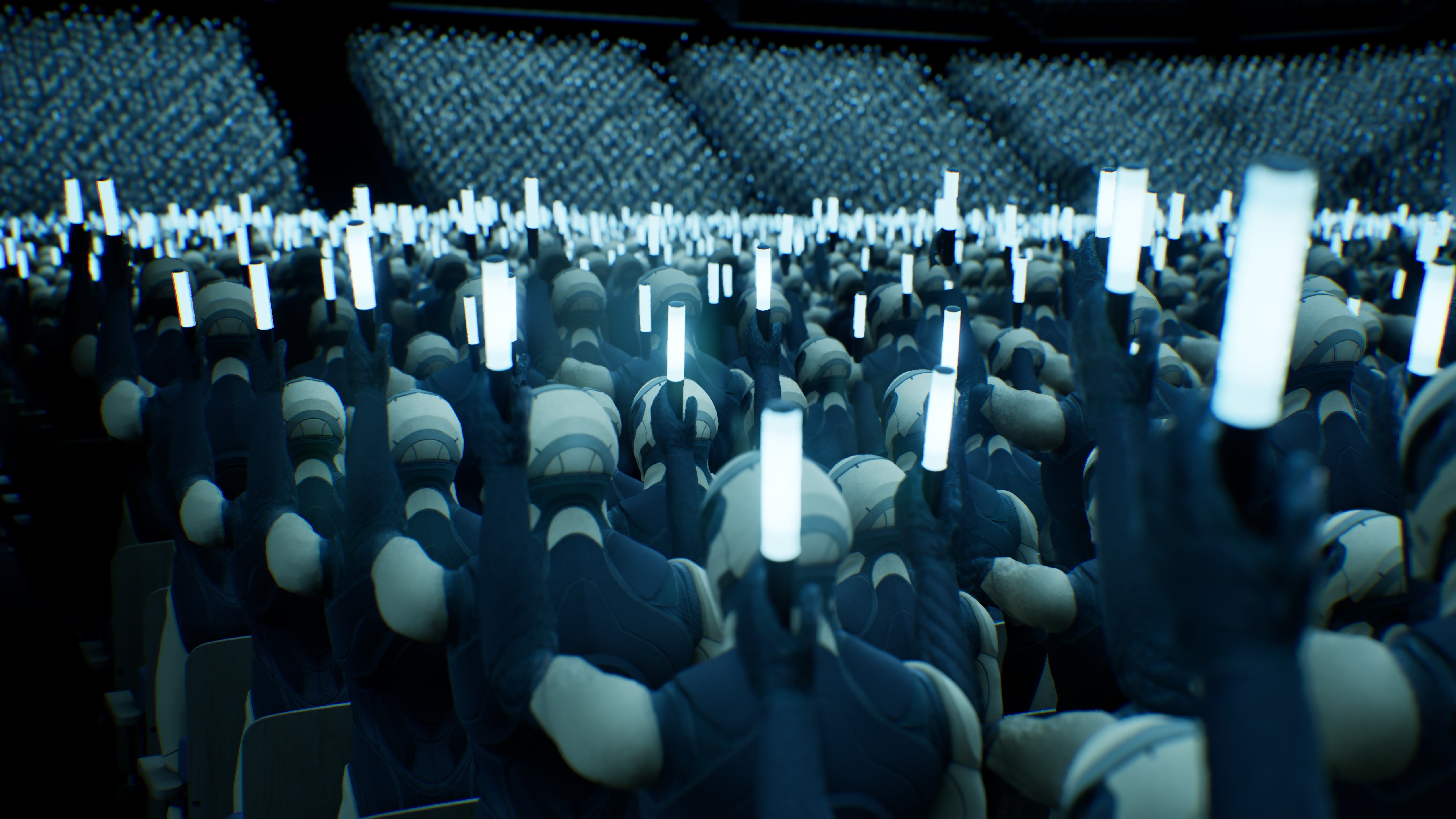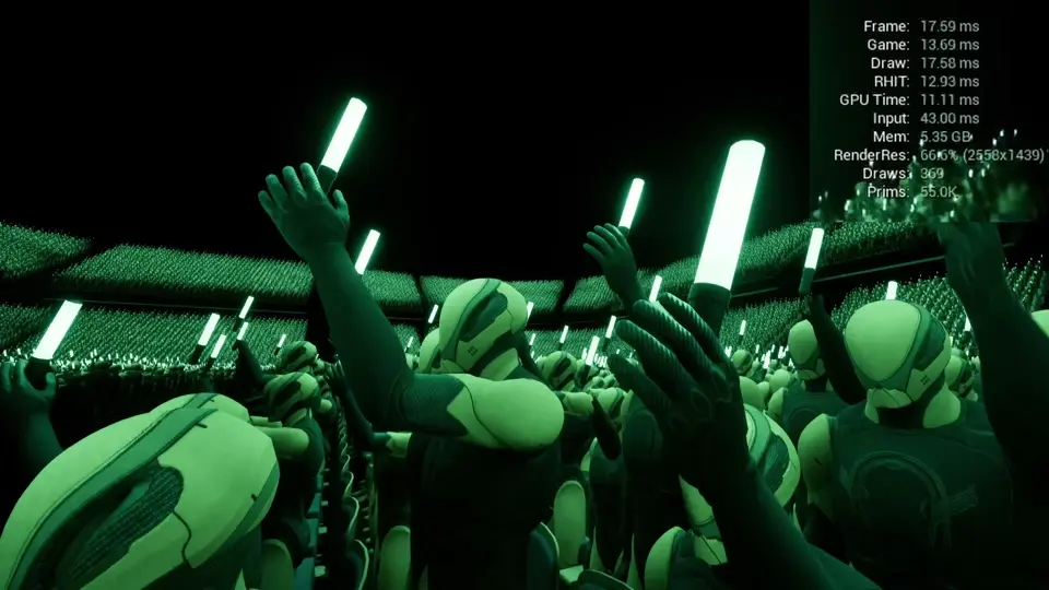 Specifically, PCG system is used to generate the venue and audiences based on splines, AnimToTexture plugin is used to create Vertex Animation Texture that enables low-cost animation for audiences, and MegaLights is used to make having hundreds of fully movable and dynamic lightings in the scene possible.
