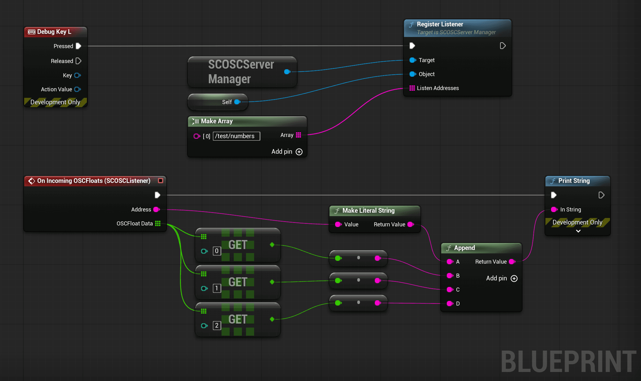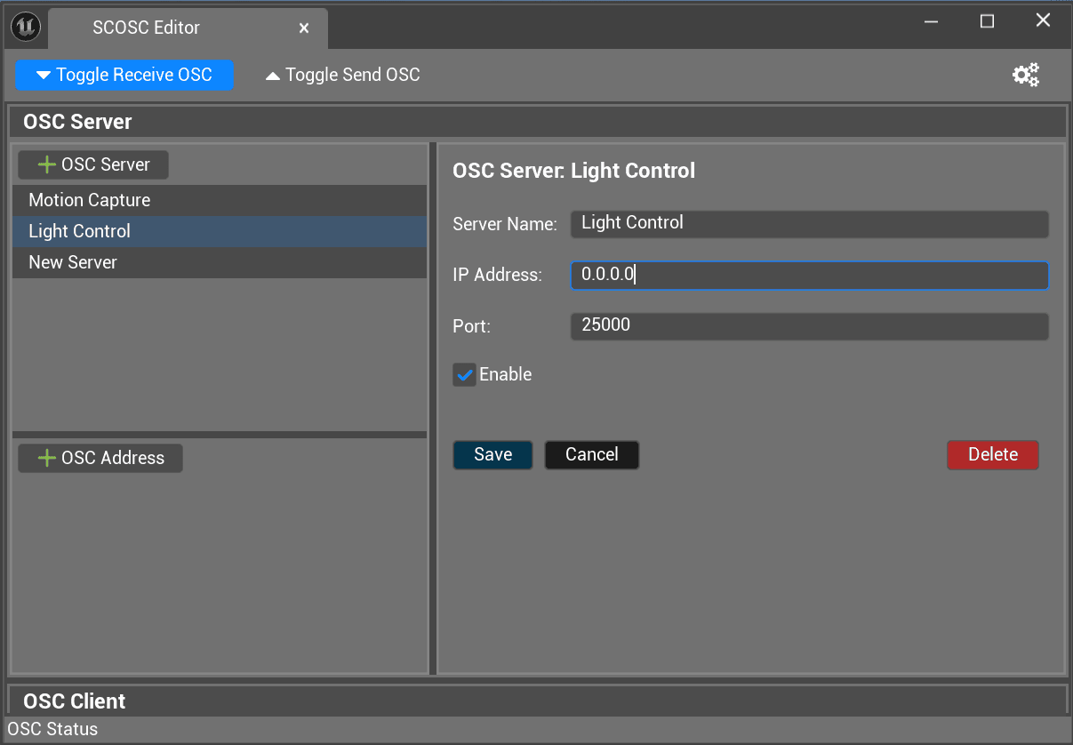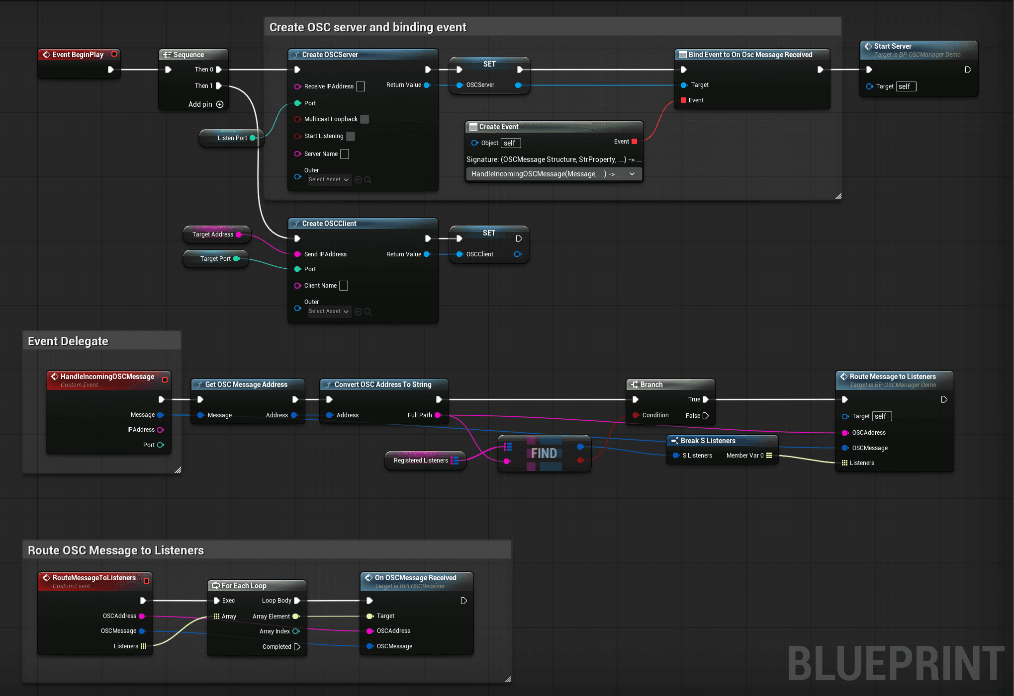 While Unreal Engine provides an official plugin for handling OSC protocols, through my personal and professional experiences in interactive projects, I have found its shortcomings in terms of intuitiveness and ease of use. Particularly, artists who are not proficient in using Blueprint face challenges in setting up servers and managing event delegates.