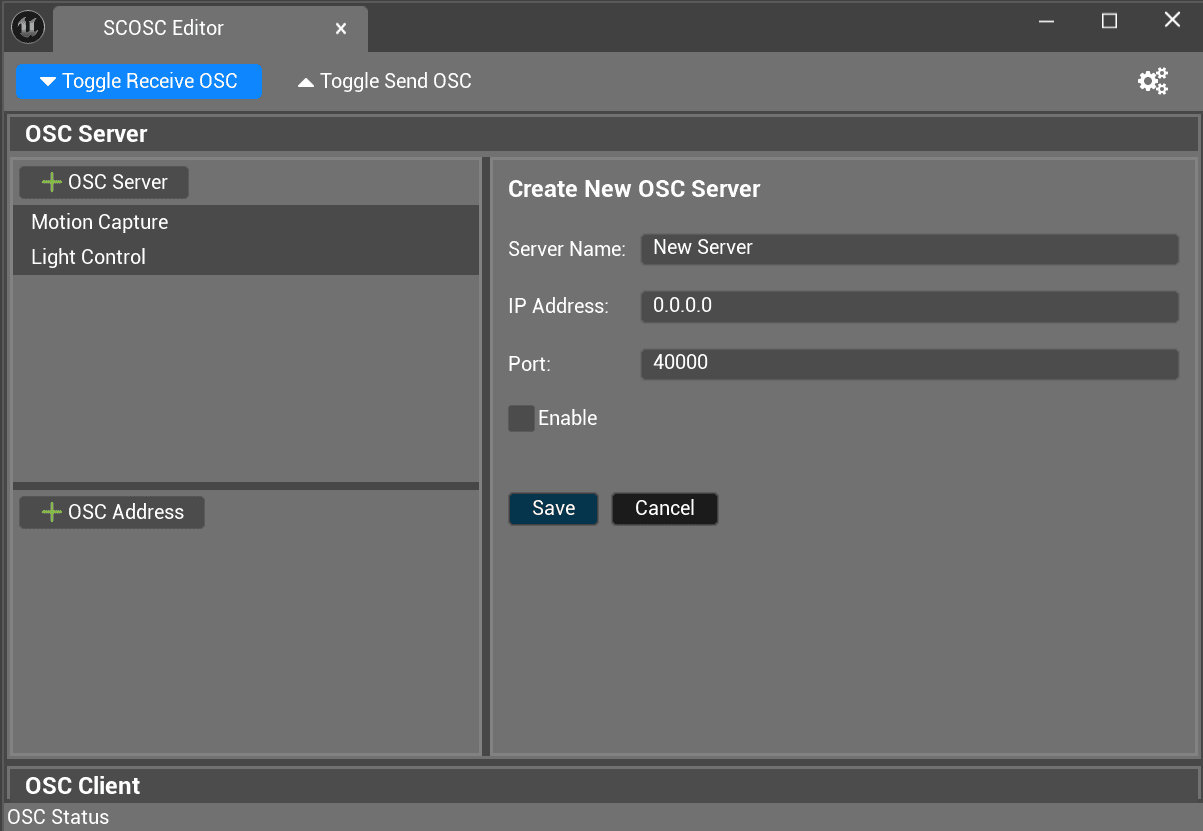 To address these issues, I started the development of this Unreal Engine plugin, which acts as a wrapper for the official OSC plugin functionalities, offering an intuitive yet informative GUI. My objective is to simplify the entire process of setting up an OSC server, listening for OSC addresses, and sending outgoing messages, allowing users to manage all aspects of OSC messaging all in one place. Additionally, the plugin allows users to persist settings across different levels without the need for repeated setup.